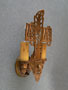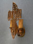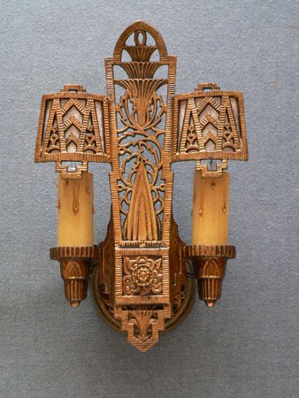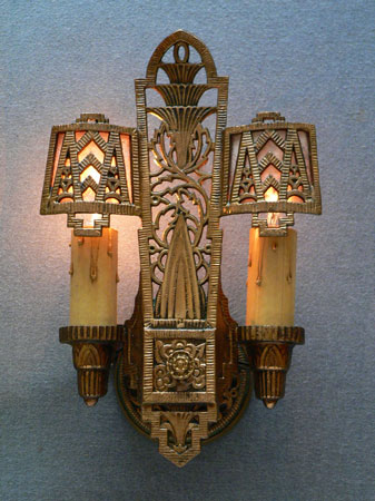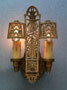 Sconce S110*Not Available* This single two light Art Deco sconces was made in the 1930's. The metal work displays the elegant geometric design and feel of the Spanish Revival movement. The faceplates are bronze with a brass backplate. New mica shades have been added to soften the light from the bulb on the candlesicks. Click here to see matching sconces (S-109) and here for matching chandelier (C-172) H: 11.5" |