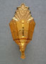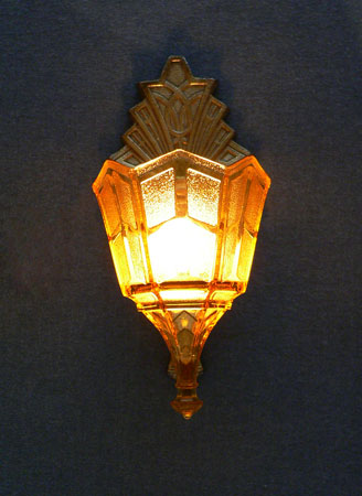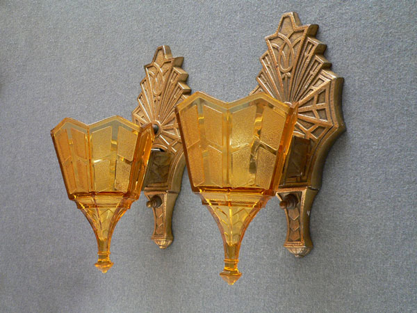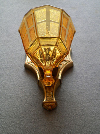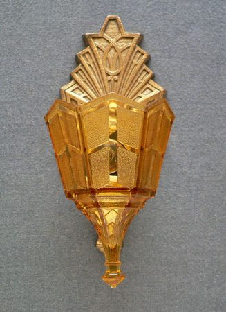 Sconce S114*Not Available* This is a wonderful pair of Art Deco sconces by Frankelite. The amber glass shades have beautiful elongated bases. The finely worked backplates have their original gold colored patina in excellent condition. Price is per pair (total of 5 individual sconces.) H: 9.75" |