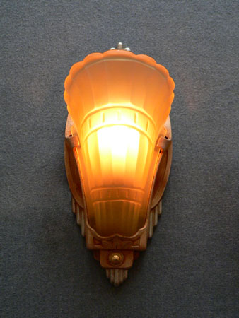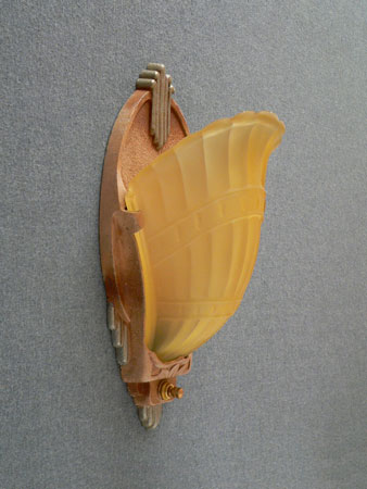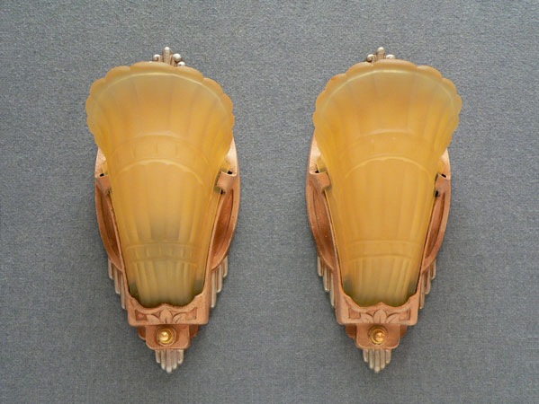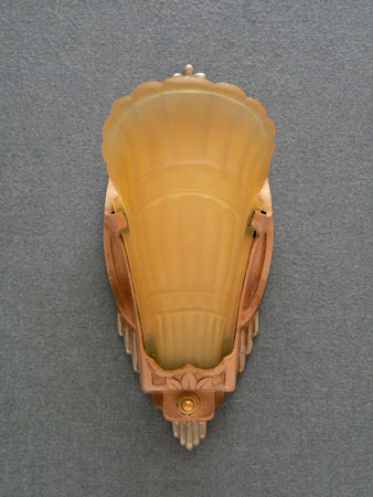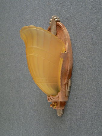 Sconce S116*Not Available* This classic pair of Art Deco sconces were manufactured by Markel in the late 1930s. The glass slip shades are reminiscent of wheat sheaves, sculpted in beautiful amber glass. The backplates have their original patina of "Herald Brown and Silver". Both the glass shades and the backplates are in very good condition. H: 11.5" |