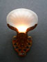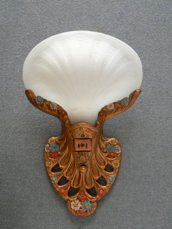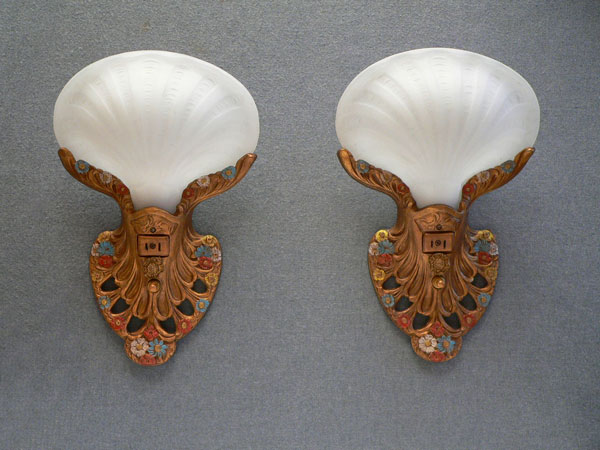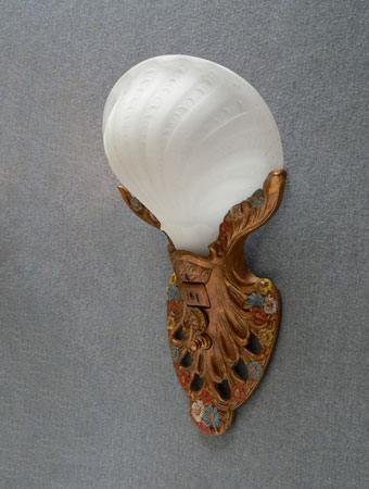 Sconce S118This elegant pair of vintage Art Deco sconces was manufactured in the 1920s. The original frosted glass shades are in the shape of clam shells. The backplates are beautifully sculpted and the patinas have been refurbished to the original bronze color with polychrome flowers. H: 12.5" |