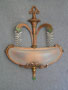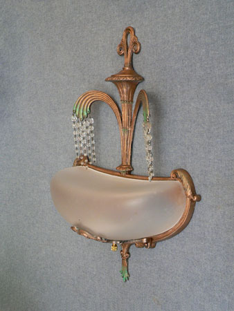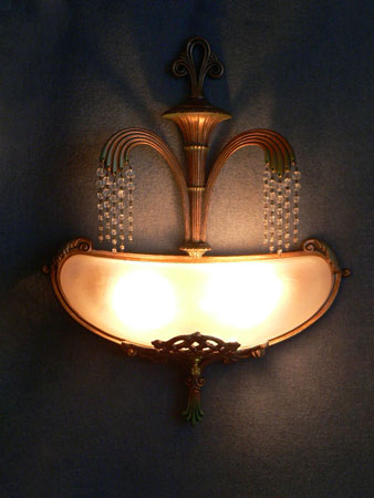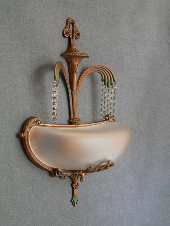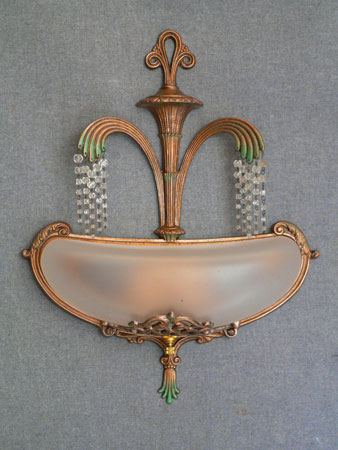Sconce S119This is a very rare pair of Art Deco sconces From the "Fountain" line of the Gill Glass Company. The frosted glass shades form a large dew drop, held in place by the latice of metalwork below. The backplates are sculpted to the form sprays of the fountain, ending with cascading crystals. The patina has been refurbished to the original polychrome of golden bronze and green. They are in excellent condition. H: 14.5" |