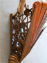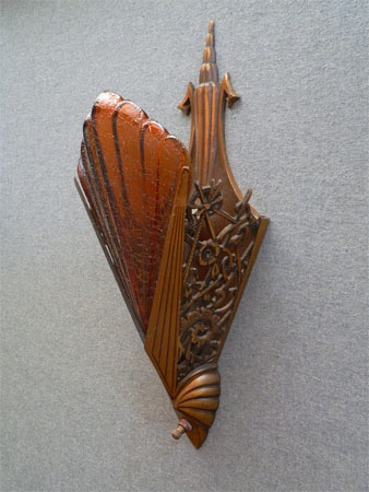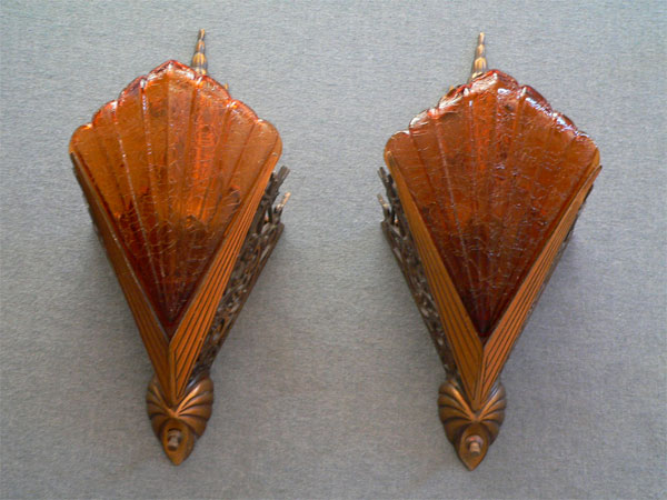 Sconce S12This is an exquisite pair of Art Deco sconces by the Cincinnati Artistic Brassworks. The glass slip shades are dark amber in color and have a "crackle effect". The delicately worked backplates are bronze and have their original patina in excellent condition. H: 15.5" |