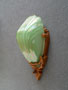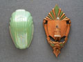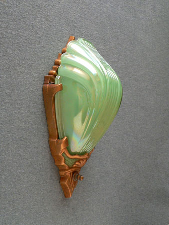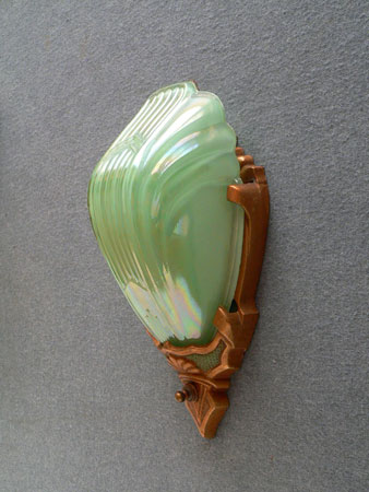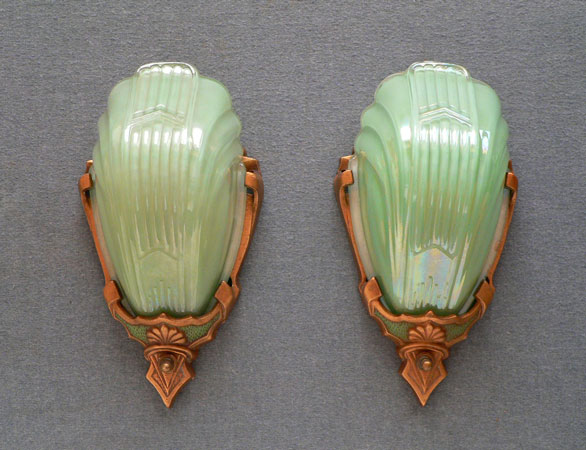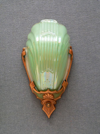 Sconce S127*Not Available* This beautiful pair of Art Deco sconce was made by the Markel Company in the 1930s. The slip shades are in the unusual color of powder green. The fixtures have their original deep gold colored patina with green accents. Both the glass and patinas are in very good condition. H: 10.5" |