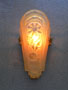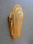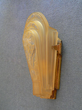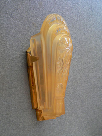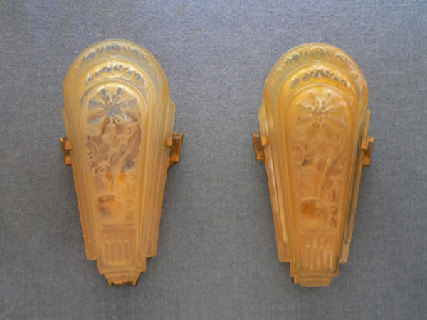 Sconce S129This pair of Art Deco sconces were made by the Lincoln Company. The amber glass, slip shades have transparent floral designs. The metal backplates are almost completely hidden by the glass. The metal has a bronze colored patina. H: 10" |