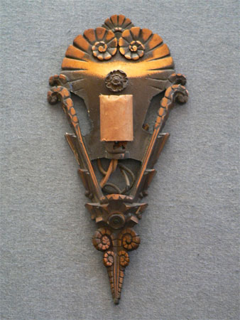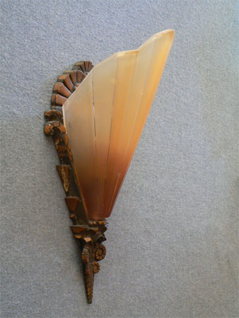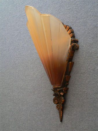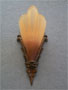 Sconce S13This pair of Art Deco sconces are part of the Soleure series, made by the Midwest Lighting Co. The glass slip shades are light amber with a brown color toward the bottom of each. The backplates are bronze with their original patina in very good condition. H: 12" |