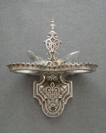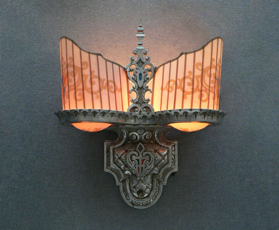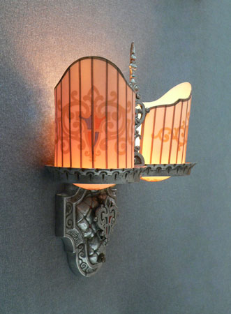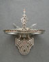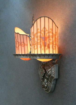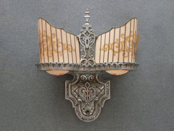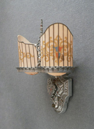 Sconce S14This is a PAIR of Art Deco sconces by the Beardslee Co. (both would not fit in the picture). Each sconce has two, creamy-white slip shades with painted heraldic designs in gold, red and blue. The ornate, silver colored backplates are designed to echo the stately designs of the shades, and have red and blue accents. H: 12" |