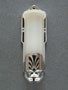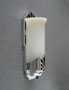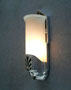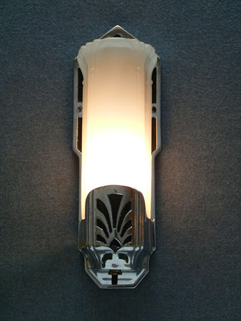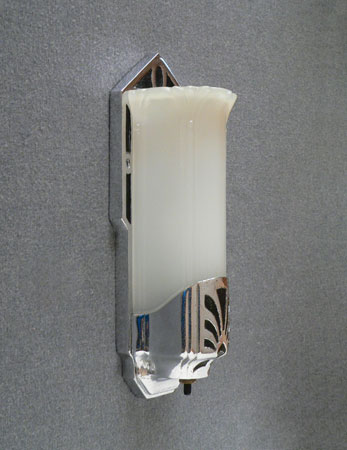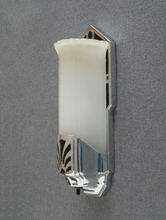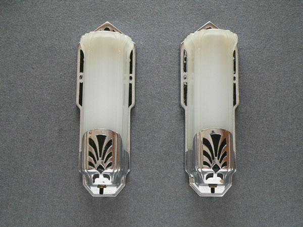 Sconce S143*Not Available* This pair of Art Deco sconces was manufactured by Moe Bridges. The elegantly elongated camphor glass slip shades are in a fluted petal form. The high polish chrome plated fixtures have recessed designs in black. Both the glass and fixtures are in very good condition. H: 11" |