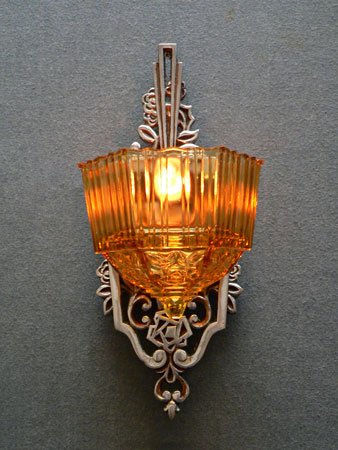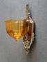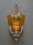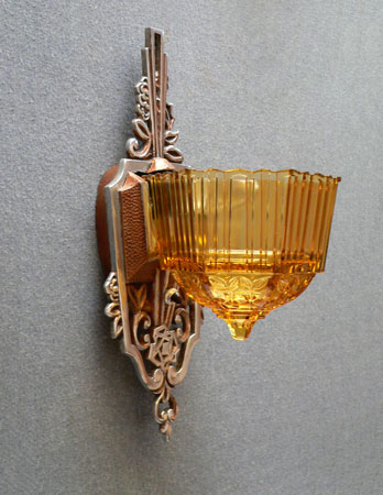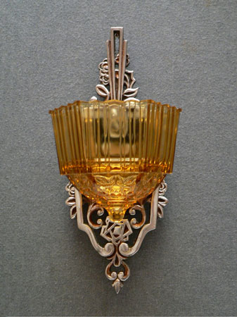 Sconce S145This beautiful Art Deco sconce was made by Markel. The clear amber glass shade is deeply molded. The elegant backplate has polished aluminum as well as areas with a bronze colored patina. The glass shade is in very good condition. H: 13" |