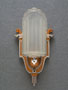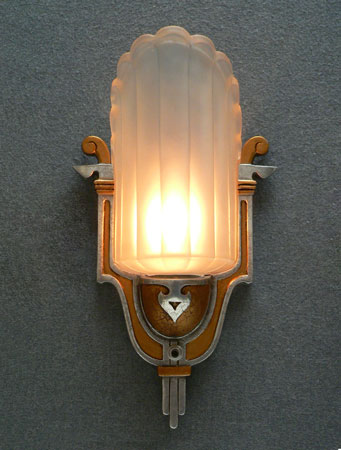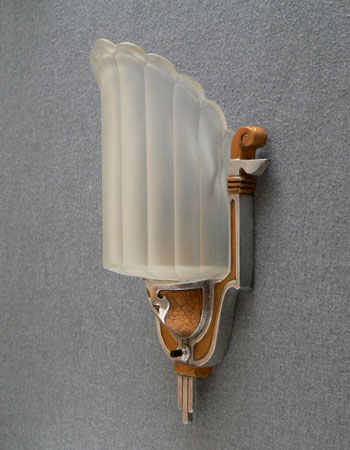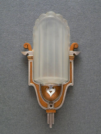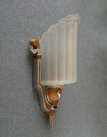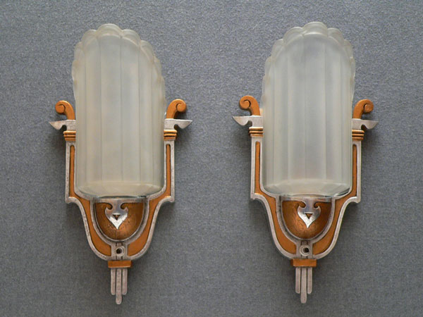 Sconce S148This striking pair of Art Deco sconces has a suggestion of Egyptian design. The frosted white slip shades are beautifully fluted and rise up ending in petal forms. The back plates are polished white metal with areas of dark gold patina. Both the glass and refurbished back plates are in very good condition. To see the wonderful matching chandelier (C-286) click here. H: 12" |