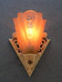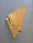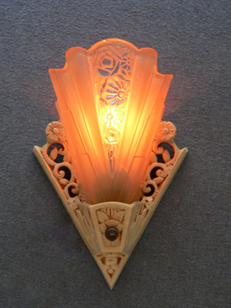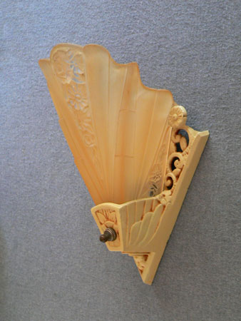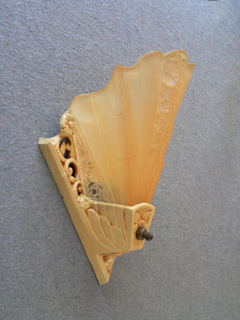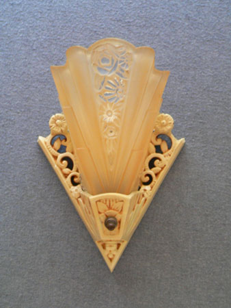 Sconce S151This set of Art Deco sconces, by Consolodated Glass, has beautiful fan shaped, amber colored slip shades with tansparent floral designs both in front and on the sides. The backplates have floral, pierce-work designs. The original patina is cream colored and in very good condition. H: 9" |