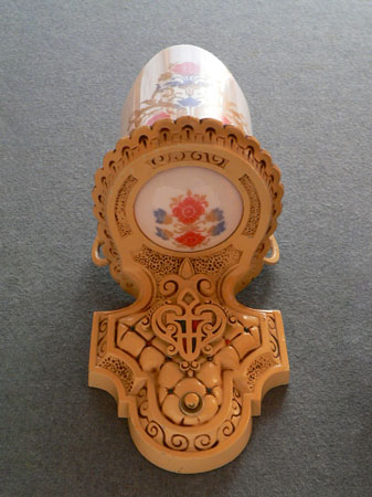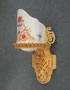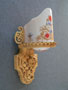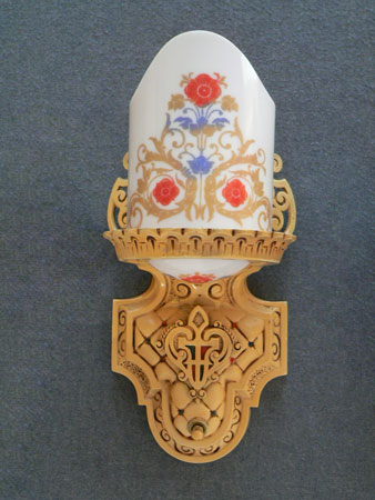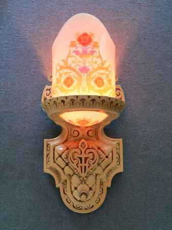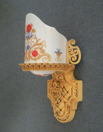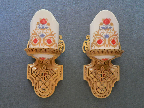 Sconce S153*Not Available* This is a pair of original Art Deco sconces by the Beardslee Company. The white, glass slip shades are painted with colorful floral designs in gold, red and blue. When lit they give off a pinkish light. The cream colored backplates are expertly sculpted. A central shield has red and blue accents. The back plates and glass are in good condition. H: 11" |