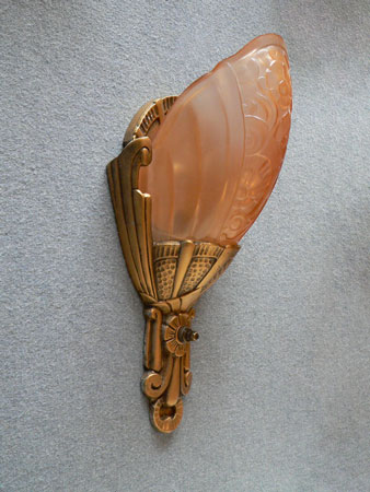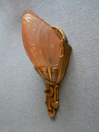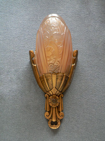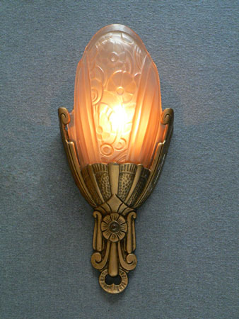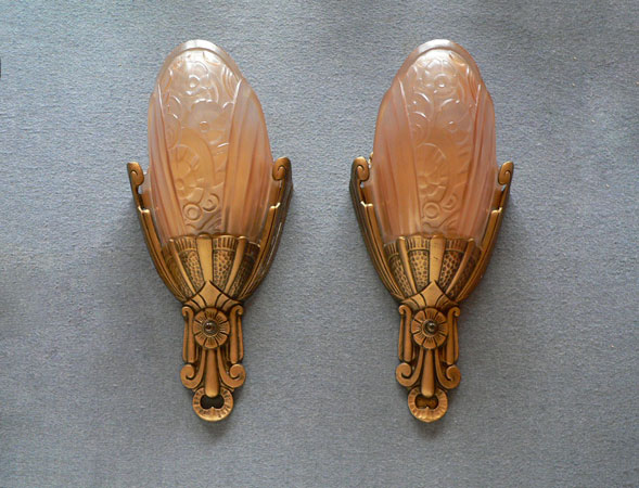 Sconce S158This is a pair of original Art Deco sconces by the Lincoln Company. The beautiful amber glass, slip shades have stylized floral designs. The backplates are a warm golden color. Both the glass and patinas are in excellent condition. H: 11.5" |