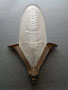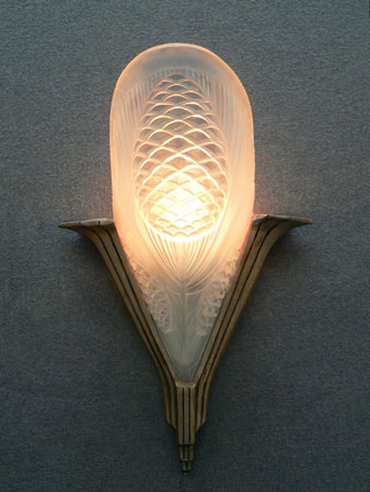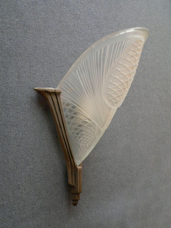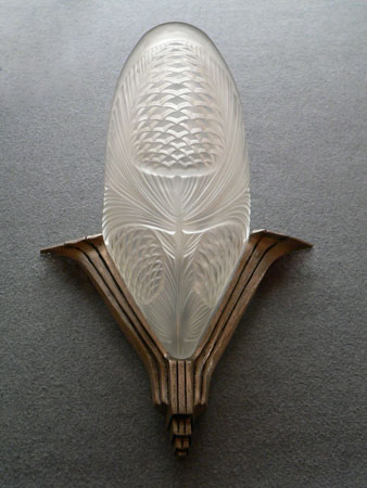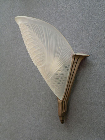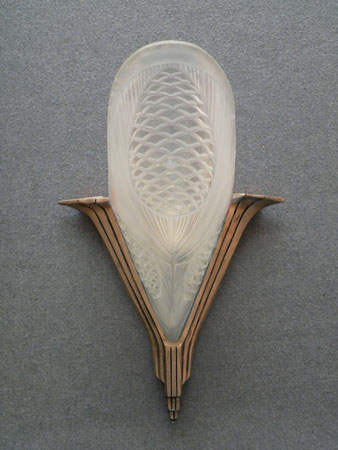Sconce S161*Not Available* This is a beautiful, large Art Deco sconce from France. The frosted glass has a lovely design depicting pine cones and pine needles. The glass shade is in very good condition. The stylish back plate is made of a silver metal. H: 14" |