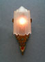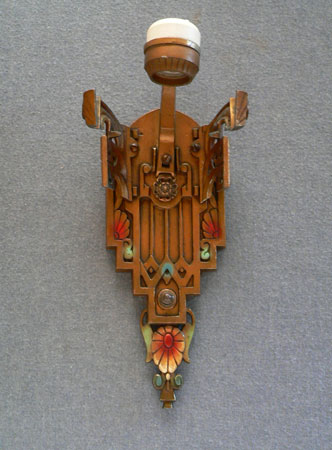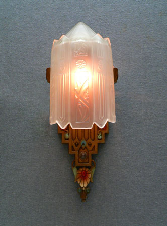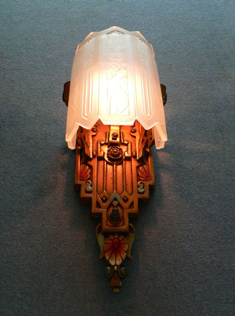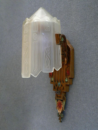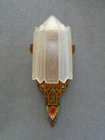 Sconce S166*Not Available* This exquisite pair of Art Deco sconces was made by Lincoln. The facets of the inverted slip shades are decorated with flower designs repeating those found in the back plates. The metal fixtures have a bronze colored patina with red, blue, green and white accents that bring out the wonderfully sculpted flowers and geometric designs. H: 14.5" |