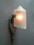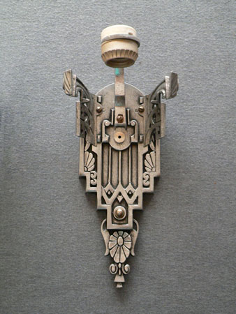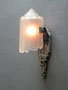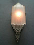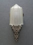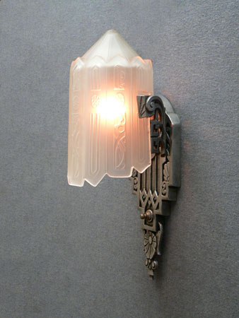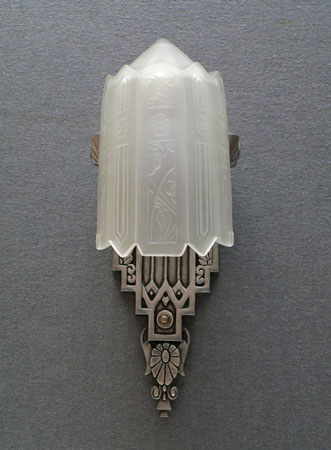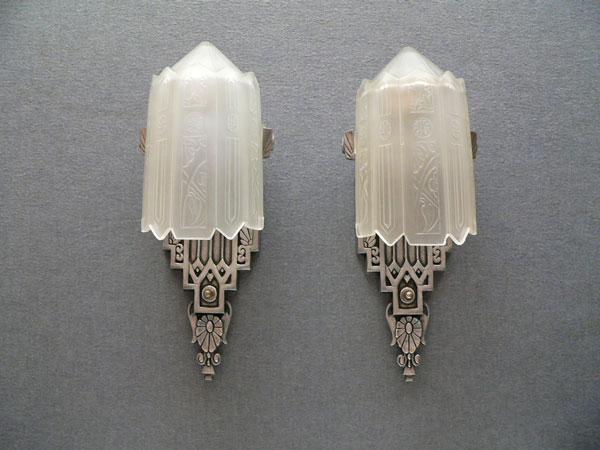 Sconce S167This exquisite pair of Art Deco sconces was made by Lincoln. The facets of the inverted slip shades are decorated with flower designs repeating those found in the back plates. The metal fixtures are aluminum with the wonderfully sculpted flowers and geometric designs brought to a high polish. H: 14.5" |