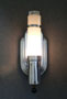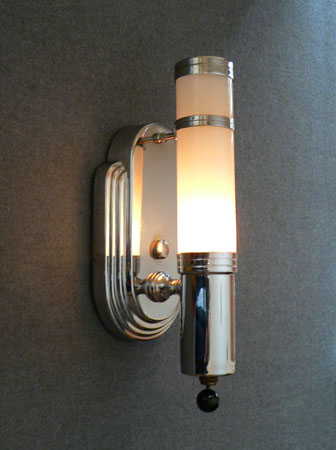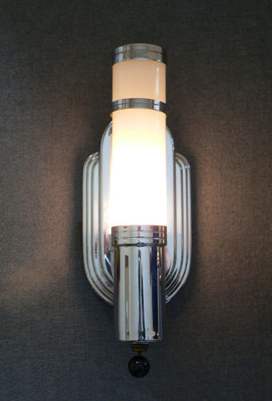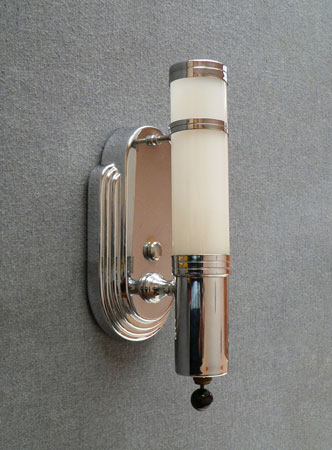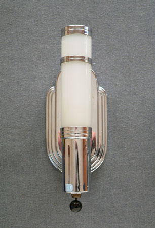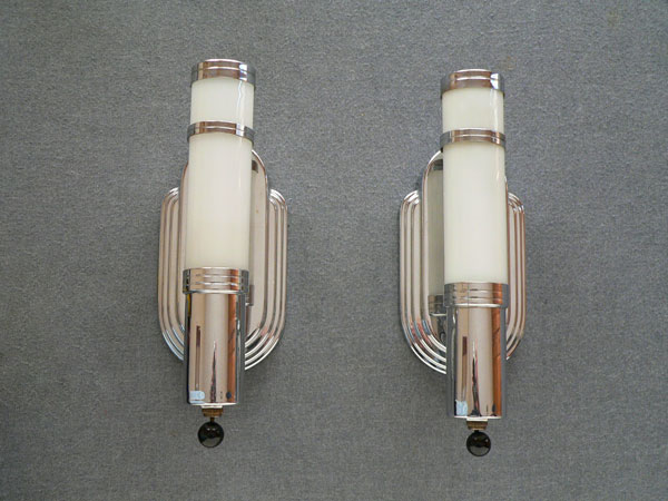 Sconce S171*Not Available* This lovely pair of Art Deco sconces has slim, milk glass cylinders, slip shades. They are held in place by a ring at the top of the modernistic chrome back plates. The glass shades are capped by a chrome ring, as well. Both the shades and back plates are in very good condition. H: 10" |