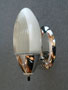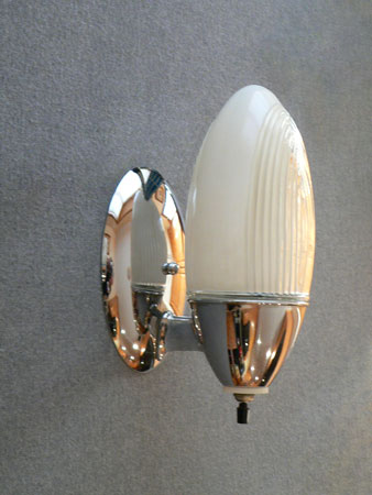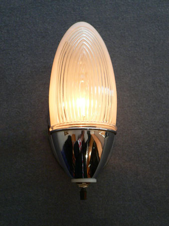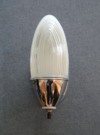 Sconce S180*Not Available* This is an original pair of Art Deco sconces by Lightolier. The classic Deco design has frosted glass in a flame shape with an area of ribbed glass toward the front. The high polish chrome fixtures compliment the shape of the glass. H: 9" |