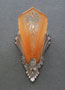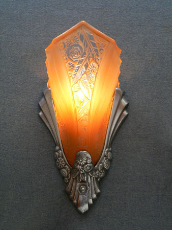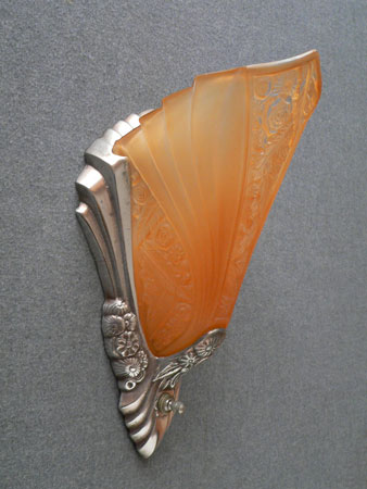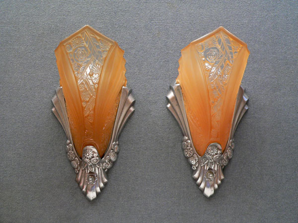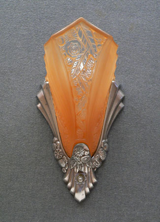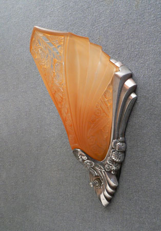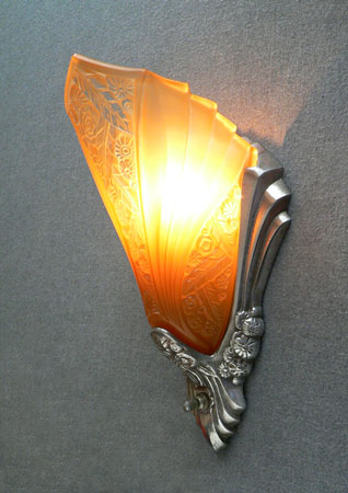 Sconce S181This is a beautiful pair of Art Deco sconces with shades by Consolidated Glass and metal backplates by Lightolier. The amber colored slip shades have an elegant fanned design, with the characteristic flower and leaf pattern of the Consolidated Glass Company. The central floral panel has clear glass on the high points of the design. The metal back plates are silver colored and have sculpted flower patterns and shapes that compliment the glass. These sconces are a lovely example of lighting from the Art Deco period. H: 12" |