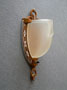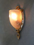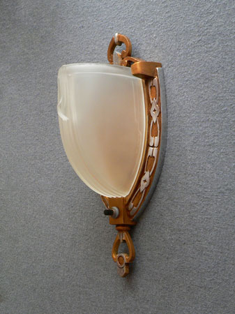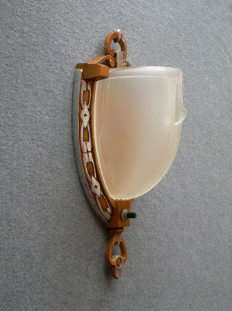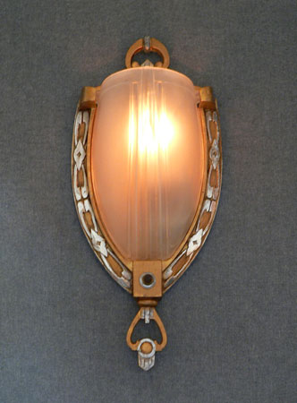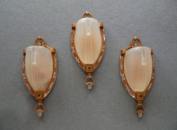 Sconce S182These three Art Deco sconces by Moe Lighting have beautiful, frosted white shades. They produce a lovely glow when lit. The silver colored metal back plates have been refurbished to match the original design. The high polish ornamentation contrasts with a gold colored patina. Both the backplates and glass are in good condition. H: 11" |