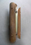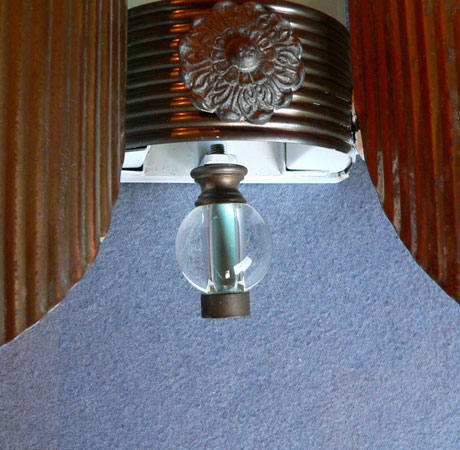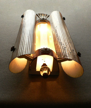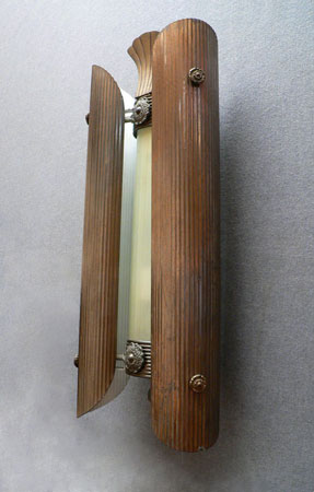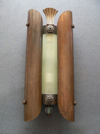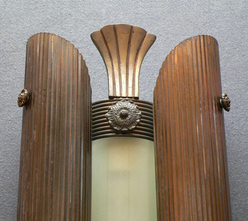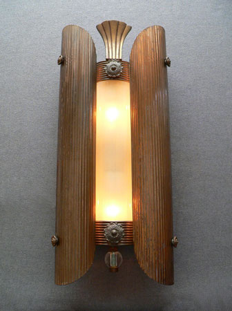 Sconce S183*Not Available* We believe this single Art Deco sconce may have adorned the old Loew's Delancey Theatre on Manhattan's lower East Side. This large sconce has a central glass cylinder, and two fluted metal side pieces shoot light both up and down. The metal is a bronze color. The design has a decorative plume at the top, and a clear ball at the bottom. All the pieces are held with metal rosettes. The metal and glass are in good condition. H: 24" |