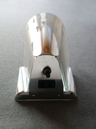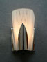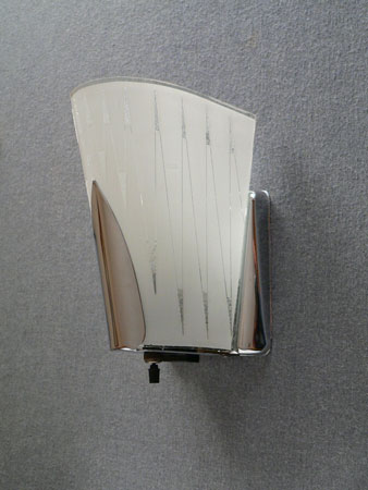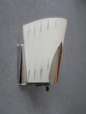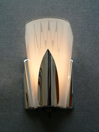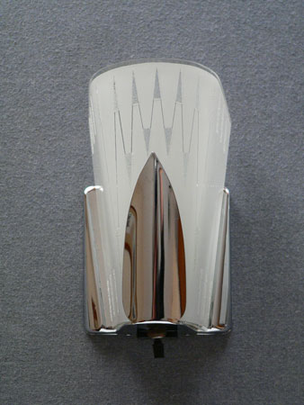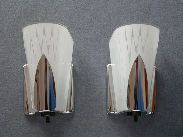 Sconce S187*Not Availalbe* This pair of Art Deco sconces by the Virden Company has a fanciful, futuristic design. The delicate glass shades are frosted white with a zig-zag pattern. There are also accents of granular glass that give some subtle sparkle. The backplates are high polished chrome. H: 8" |