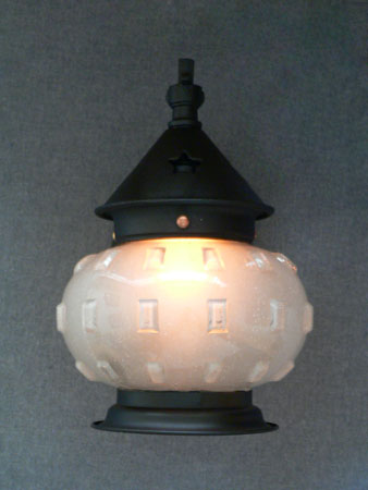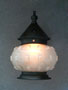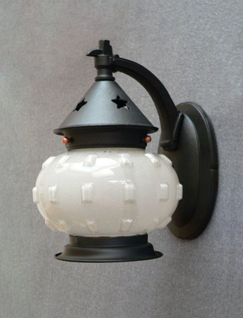 Sconce S190*Not Available* This antique Art Deco porch light has a charming "pot belly" design with a wonderfully knobbed, white glass shade. The metal fixture is iron with a black patina. It is rewired and ready to hang. H: 10" |