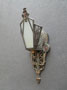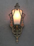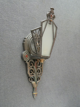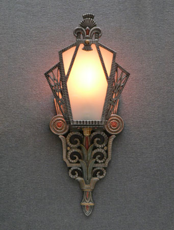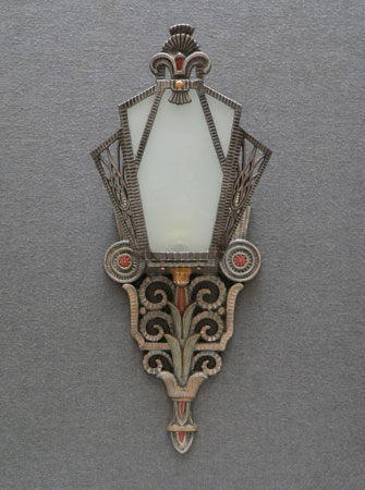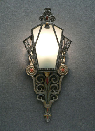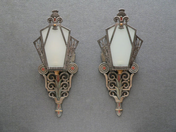 Sconce S197*Not Available* This pair of Art Deco sconces from the 1930s are part of the "Modernistic Series" by the Frankelite Co. The frosted white shade is held in a lattice work of metal with an Egyptian type flourish at the top. The back plates have ornate scroll work. The use of colored bulbs can be used to give a warm glow, as seen in one of the pictures. The patina is silver colored with subtle accents of gold, red, and green. H: 12" |