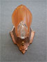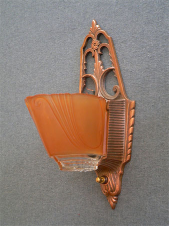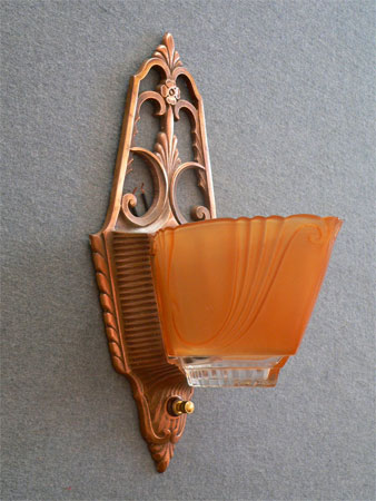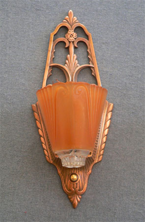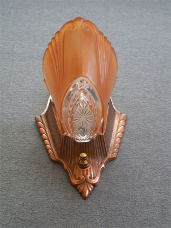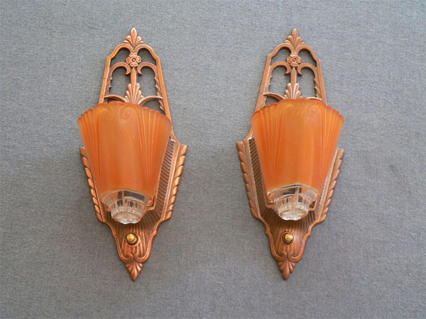 This pair of original Art Deco sconces have deep amber colored slip shades with clear glass on the bottom of each. The elegant backplates have their original copper colored patina in excellent condition. Click to see matching chandeliers (C-65) and sconces (C-119)