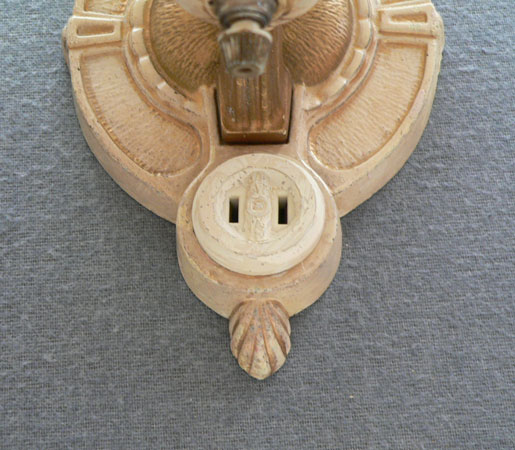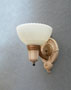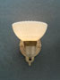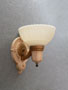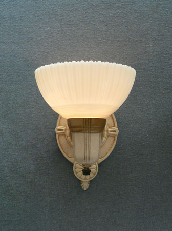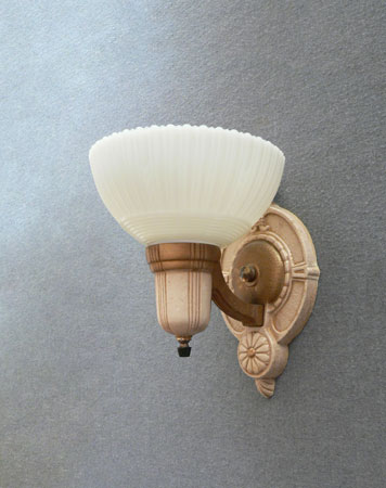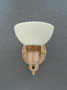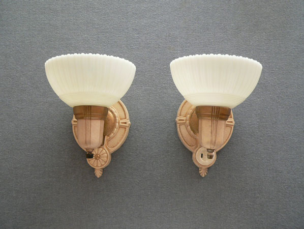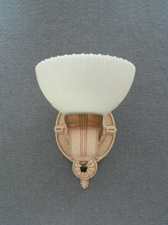 Sconce S201*Not Availabel* This pair of Art Deco sconces from the 1930s have beautifully scalloped glass shades. The sculpted backplates are cream colored with gold colored accents. One back plate has a re-wired, functioning electrical socket. Both the glass and back plates are in good condition. H: 8" |