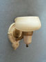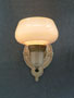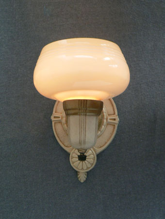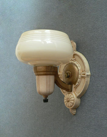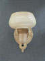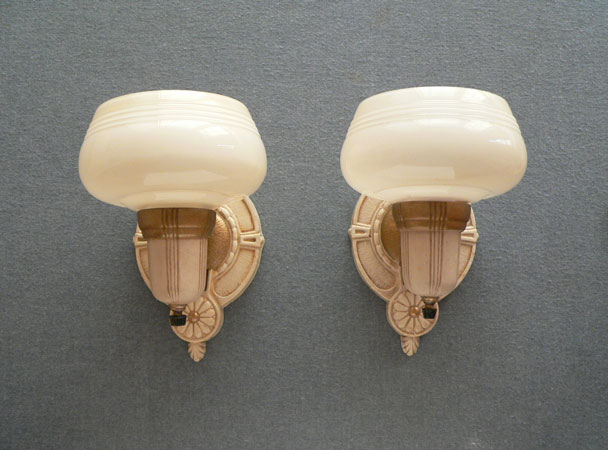 Sconce S202*Not Available* This pair of Art Deco sconces from the 1930s have beautifully formed custard glass shades. The backplates are cream colored with gold colored accents and textured surfaces. Both the glass and back plates are in good condition. H: 8" |