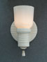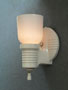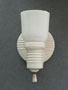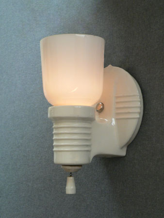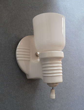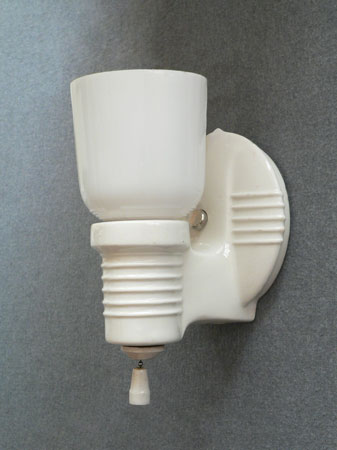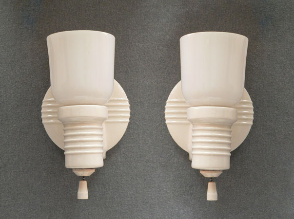 Sconce S206*Not Available* This pair of porcelain Art Deco sconces has white, tulip shaped slip shades. The white porcelain back plates have a classic Deco form with five decorative parallel ridges on both the circular section as well as the arm holding the shade. Perfect for bathroom or kitchen, they are rewired and ready for installation. H: 8" |