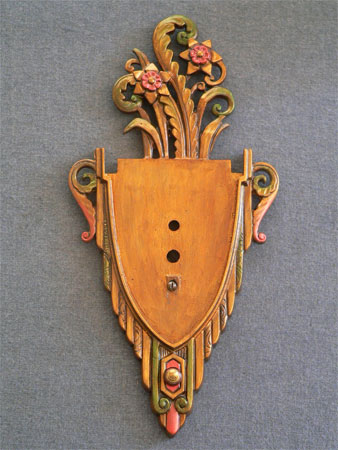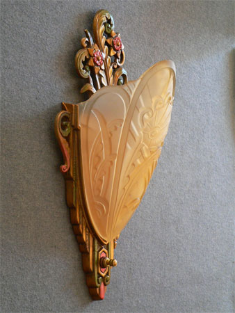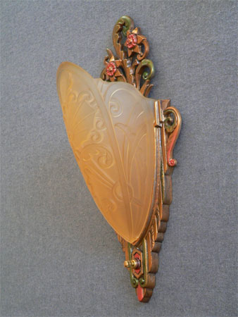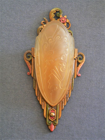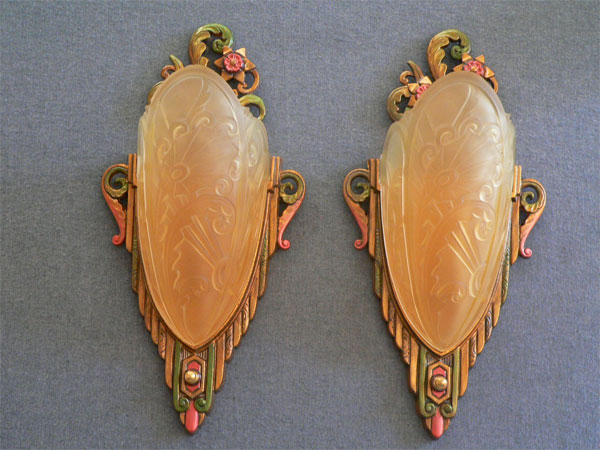 Sconce S21*Not Available* This pair of Art Deco sconces is by the Lincoln Company. The amber glass, slip shades have floral designs. The metal backplates have been refurbished to their original polychrome design: gold colored with green and red accents. H: |