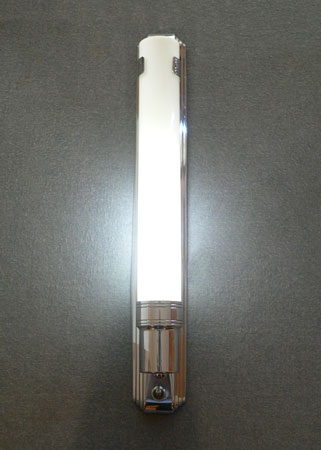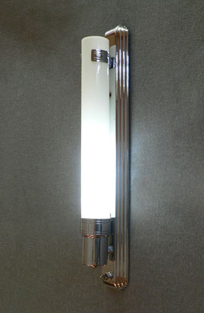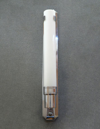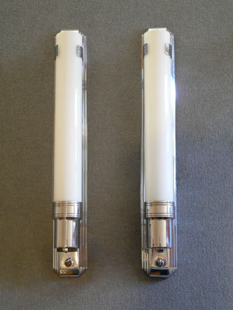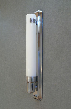 Sconce S210*Not Available* This pair of Art Deco sconces have milk glass slip shades. The slender glass cylinders are held in chrome back plates with a simple design. Both the glass and back plates are in very good condition. They are rewired and ready for instalation. H: 17" |