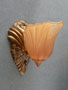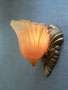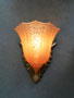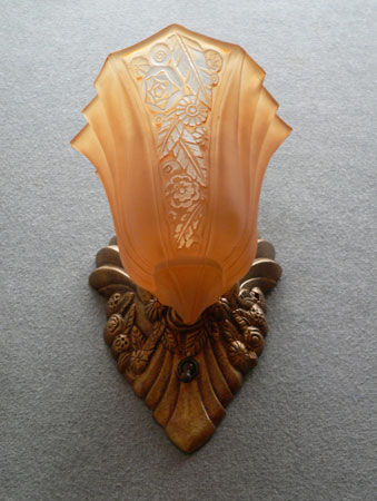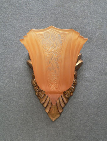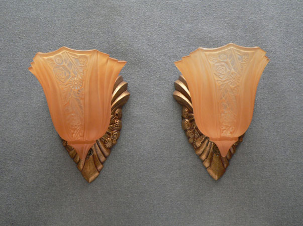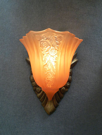 Sconce S213This pair of lovely Art Deco sconces was manufactured in the 1920s by Lightolier with shades made by Consolidated Glass. The amber colored glass shades have front panels depicting a stylized floral pattern surrounded by gracefully curved ridges. The back plates are beautifully sculpted and reflect the designs in the glass. The metal has a dark brass colored patina. They are rewired and ready for installation. H: 9" |