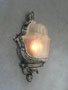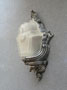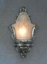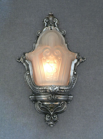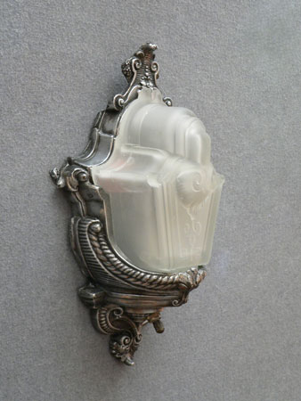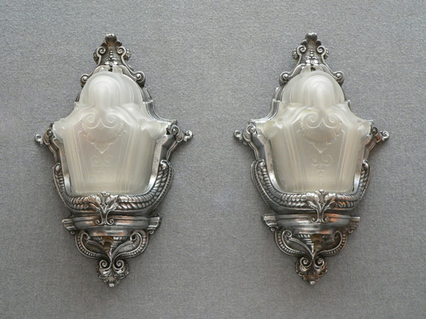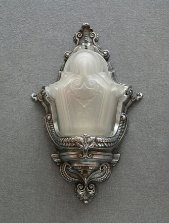 Sconce S215*Not Available* This pair of original Art Deco sconces was manufactured in the 1920s. The frosted white glass have been molded into an intricate form. The back plates are sculpted with great detail and reflect the designs in the glass. The metal is silver colored with areas of high polish. They are rewired and ready for installation. H: 11.5" |