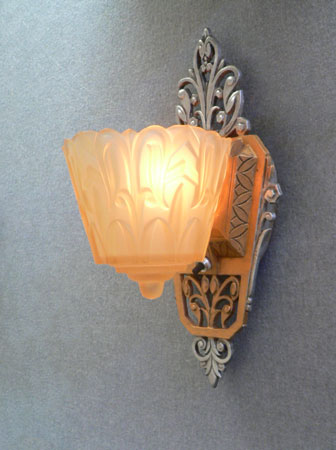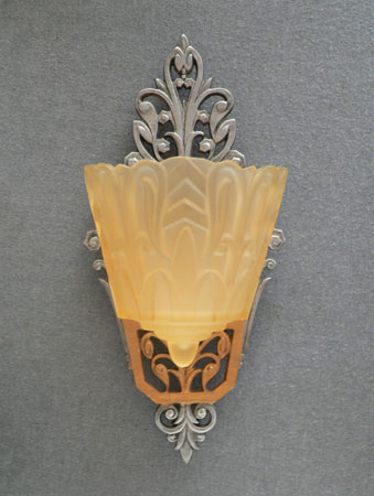 Sconce S226This beautiful pair of Art Deco sconces was made by Lincoln in the 1930s. The amber, glass slip shades have stylized designs, in deep relief, suggesting leafy vegitation. The back plates compliment the shade design with lovely floral elements. They have a dark gold colored patina, as well as polished silver metal. H: 12" |