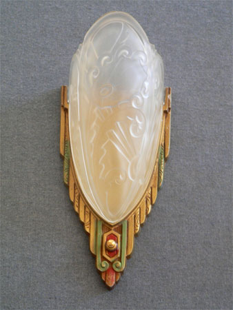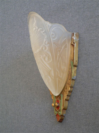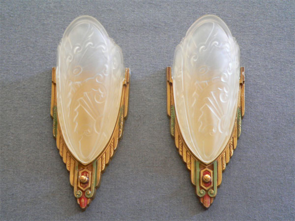 Sconce S23*Not Available* This pair of Art Deco sconces was made by the Lincoln Company. The frosted white, glass slip shades have floral designs. The metal backplates have their original gold colored patina, with red and green accents, in good condition. H: |