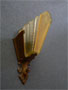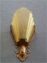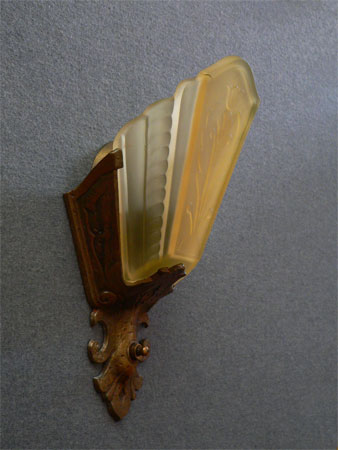 Sconce S3This pair of origianl Art Deco sconces were manufactured by the Virden Company. They each have a yellow glass, slip shade with a stylized floral design. The metal backplate is cast iron with a light bronze patina in excellent condition. H: 11.5" |