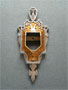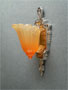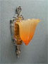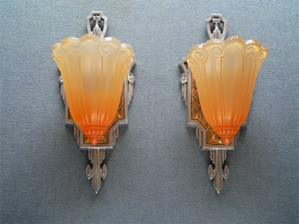 Sconce S33*Not Available* This pair of authentic ARt Deco sconces were made by the Lincoln Company. They are from the "fleur de lis" collection featuring orange glass, slilp shades with higher intensity of color toward the bottom. The backplates have their original patina, of silver metal with gold colored designs, in perfect condition. H: 12" |