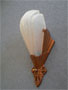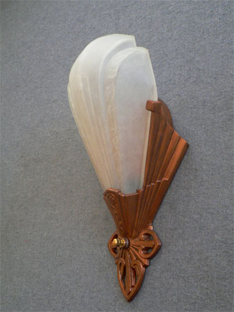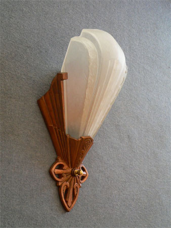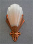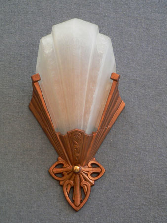 This original Art Deco pair of sconces was made by the Virden Company. The frosted glass, slip shades have fine designs in the glass. The backplates have been professionally refinished to the original copper color. (two pairs available)