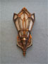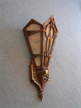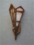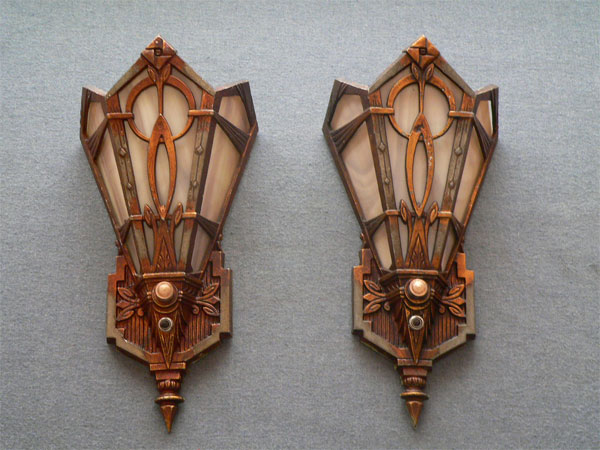 Sconce S5*Not Available* These large, original Art Deco sconces were most likely designed for an old movie house. Each has three marblized glass panels. The stylized metal work is sliver colored with copper colored areas. The patina is in very good condition. H: 14" |