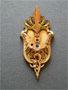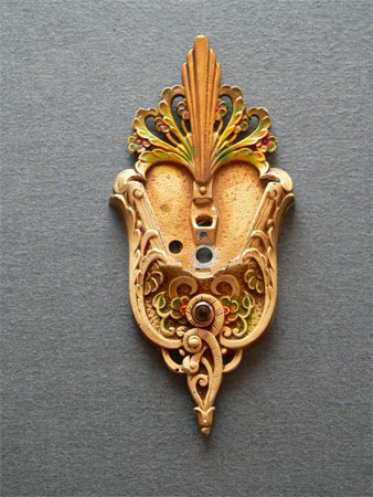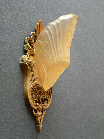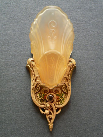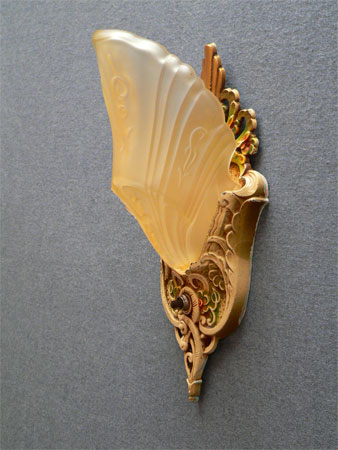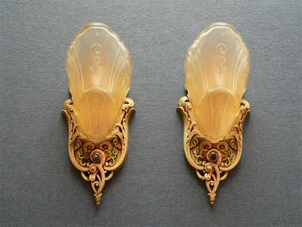 Sconce S51*Not Available* This pair of sconces were made by Markel in the late 20's. The heavy metal backplates have a polychrome patina with red and green accents on the floral designs. The slip shades are frosted amber glass with stylized floral designs. The patinas are original and in very good condition. These sconces match Chandeliers C62 and C64. H: 12" |