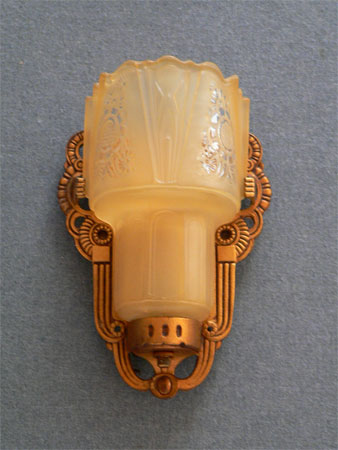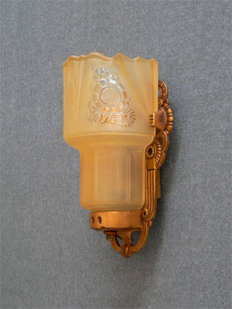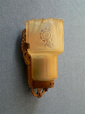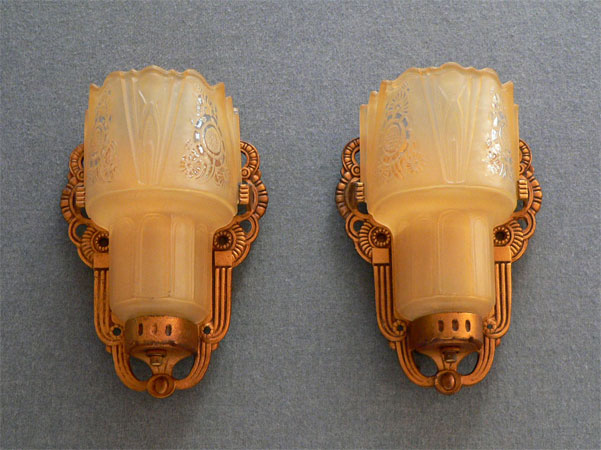 This beautiful pair of Art Deco sconces, by the Lightolier Company, have beautifully sculpted, amber colored slip shades with tansparent floral designs. The heavy metal backplates have gracefully curved, decorative designs. The patina has been refurbished to its original dark gold color. H: 8" |