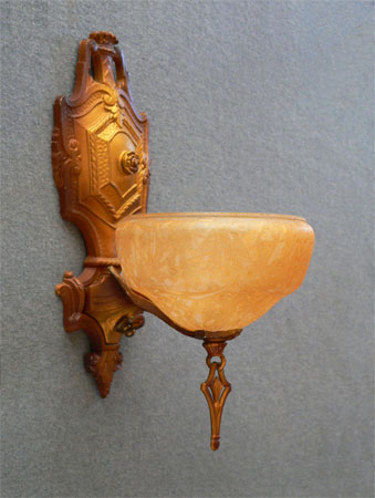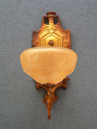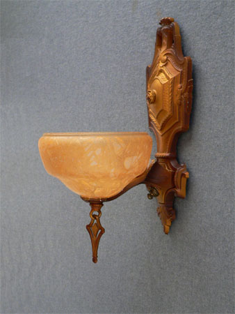 Sconce S59This is a single Art Deco sconce made by the Markel Company in the 1930s. The glass slip shade is in unusual powder green glass. The fixture has its original cream colored patina with green accents. Both the glass and fixture are in very good condition. H: 12" |