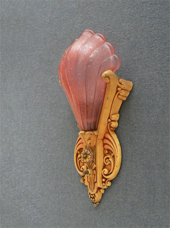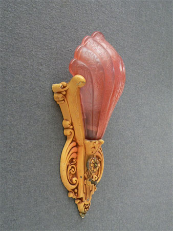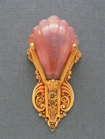 Sconce S61*Not Available* This single Art Deco sconce was made by the Markel Company in the 1930s. The scalloped glass shade is made of rose colord glass. The floral motif fixture has its original cream colored patina with pink accents and light touches of green. Both the glass and fixture are in very good condition. H: |