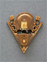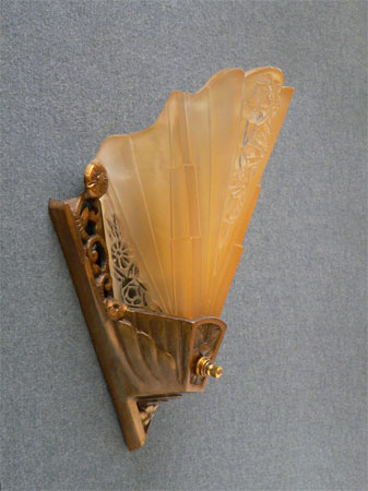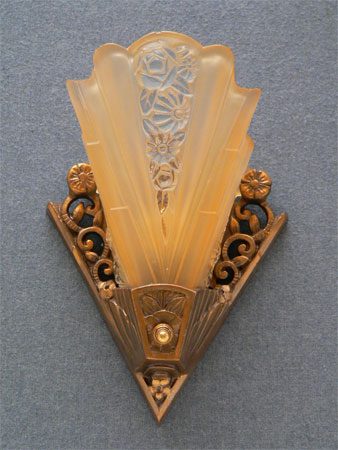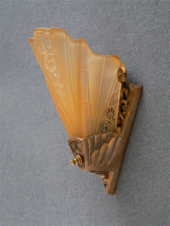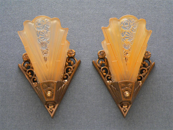 This set of two matching Art Deco sconces, by Consolodated Glass, have beautiful fan shaped, amber colored slip shades with tansparent floral designs both in front and on the sides. The aluminum backplates have floral, pierce-work designs. The professionally refurbished patina is bronze colored. H: 9" |