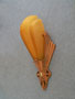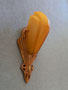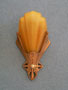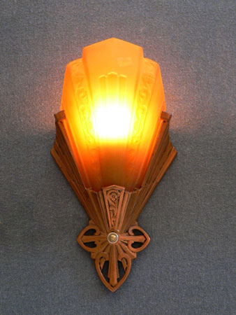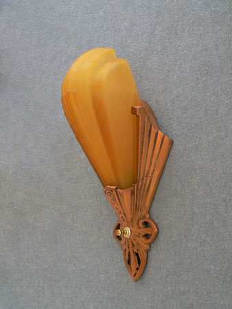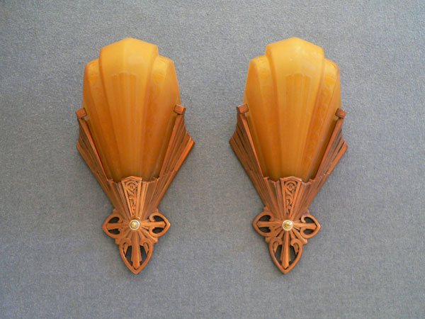 Sconce S70This original Art Deco pair of sconces was made by the Virden Company. The amber glass, slip shades have delicately sculpted designs and are in excellent condition. The backplates have their original copper colored patina and are in excellent condition as well. H: 11" |