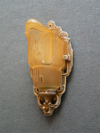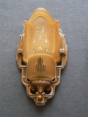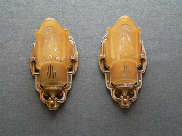 Sconce S8*Not Available* This pair of original Art Deco sconces have amber colored, slip shades with a very stylized design and shape. The metal backplate is gold and silver colored. H: 10" |