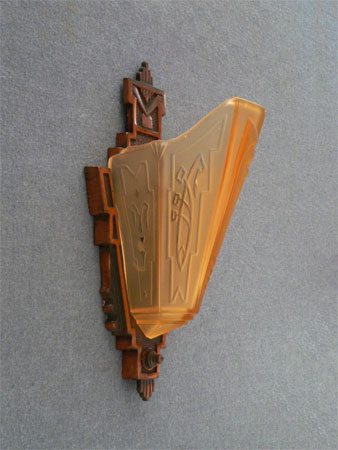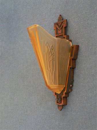 Sconce S87This pair of Art Deco sconces was made by the Markel Company. The golden, amber glass, slip shades have elegant geometric designs. The iron backplates have their original copper colored patina. Both glass and metal are in perfect condition. (two pairs are available) H: 12" |