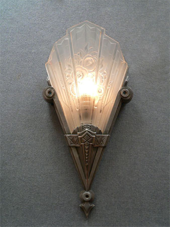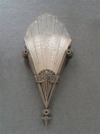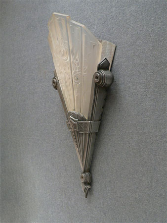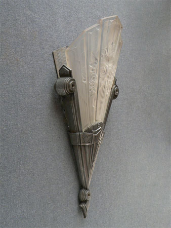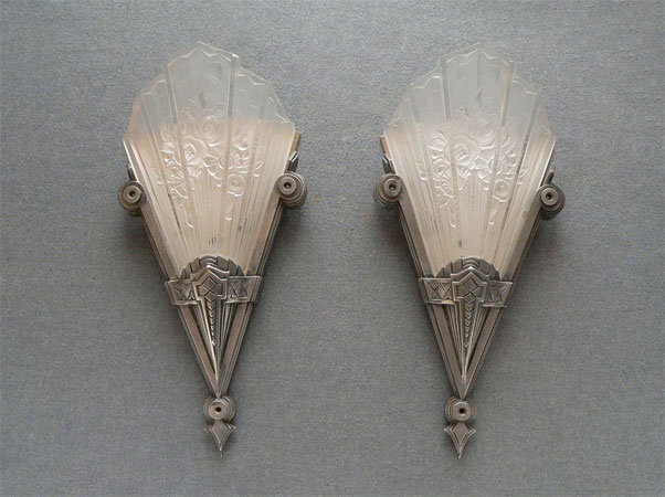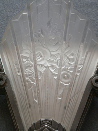 Sconce S95*Not Available* This exquisite pair of French Art Deco sconces was made by Verrerie des Hanots in the 1930s. The lightly frosted glass slip shades have sculpted roses on a delicate fan. Each shade bears the name of the manufacturer. The silver colored metal fixtures have classic Deco lines. There is also a brushed metal panel behind each glass shade. They look as if they were chiseled from ice. These are beautiful examples of French Deco. (Be sure to scroll down for all the pictures) H: 15" |
